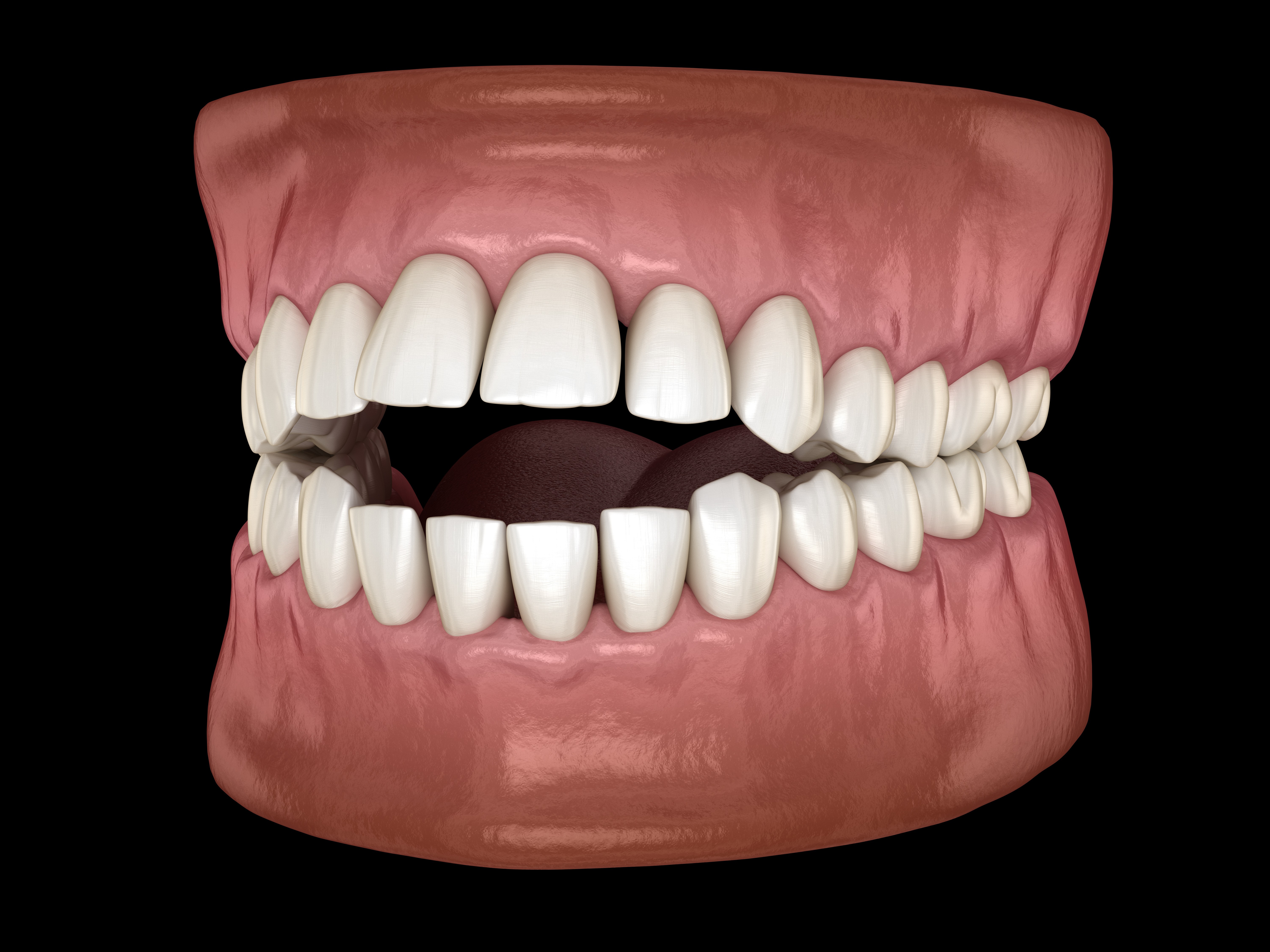 An open bite occurs when the upper and lower front teeth do not come together when biting, resulting in an open space between the two. This is often the result of tongue thrusting (also called infantile swallowing pattern) and/or prolonged thumb sucking.
